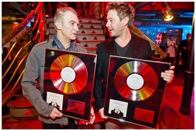 Seweryn Krajewski i Andrzej Piaseczny odbierają platynowe płyty za album „Jak tam jest” (foto: Rafał Nowakowski/facebook.com)
