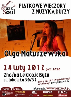 Piątkowe wieczory z muzyką duszy – cykl koncertów prezentujących soulowych i jazzowych wykonawców, już 24 lutego będzie miał swoją drugą odsłonę. W warszawskim klubie Znośna Lekkość Bytu wystąpi Olga Matuszewska.