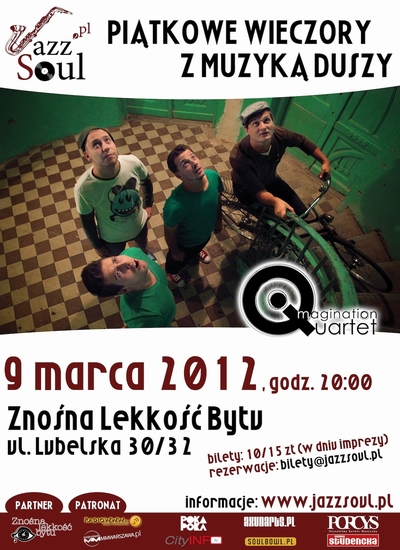 Nagroda: W konkursie tym, dzięki uprzejmości organizatorów koncertu, przygotowaliśmy dla Was dwa podwójne zaproszenia na występ zespołu Imagination Quartet, jaki odbędzie się 9 marca 2012 r. w ramach cykli Piątkowe wieczory z muzyką duszy (Klub Znośna Lekkość Bytu, ul. Lubelska 30/32, Warszawa; szczegóły).