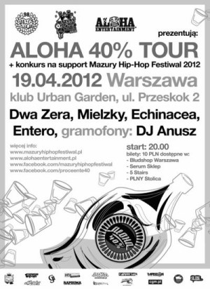 W czwartek, 19 kwietnia, na kolejną imprezę z cyklu Aloha 40% Tour do Urban Garden zapraszają organizatorzy festiwalu Mazury Hip-Hop 2012, wytwórnia Aloha Entertainment oraz firma odzieżowa Mass Denim. W jeden wieczór na jednej scenie pojawią się: Dwa Zera, Mielzky, Echinacea, Entero oraz Dj Anusz. Początek imprezy o godzinie 20:00.