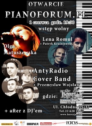 Forum PianoForum.pl, według założycieli, skierowane jest dla wszystkich fanów muzyki oraz instrumentów klawiszowych. Impreza na otwarcie odbędzie się 1 czerwca w warszawskiej Herezji. Na jednej scenie wystąpią znakomici muzycy: Olga Matuszewska, Lena Romul wspólnie z Patrykiem Kraśniewskim oraz AntyRadio Cover Band z Przemysławem Wojsławem. Po wszystkich koncertach odbędzie się after party. Poniżej szczegółowy rozkład koncertów.