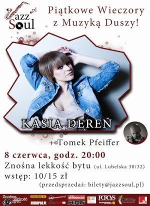 Cykl Piątkowe Wieczory z Muzyką Duszy, którego organizatorem jest portal jazzsoul.pl, wedle założenia prezentuje zespoły i wykonawców z pogranicza muzyki soul, jazz, funky i r&b. Miejscem muzycznych spotkań jest warszawski klub Znośna Lekkość Bytu. W ramach cyklu, który objęliśmy patronatem, wystąpiły do tej pory m.in. Marcelina i Olga Matuszewska. Kolejną gwiazdą wieczoru będzie Kasia Dereń, którą 8 czerwca na scenie wesprze gitarzysta Tomek Pfeiffer.