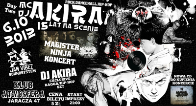 DJ/MC Akira – jeden z pionierów muzyki drum’n’bass w Polsce, świętuje obecnie swoje 15-lecie działalności na scenie muzycznej. 5 i 6 października odbędą się specjalne imprezy celebrujące to wydarzenie. Zaprezentują się na nich wykonawcy bliscy sercu didżeja, jak również on sam.