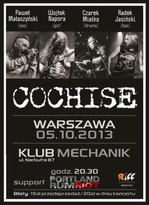 5 października w warszawskim klubie Mechanik odbędzie się koncert zespołu Cochise supportowanego przez Portland Rum Riot. Impreza zaczyna się o godzinie 20:30. Wstęp w dniu koncertu 20 złotych, w przedsprzedażny 15 złotych.