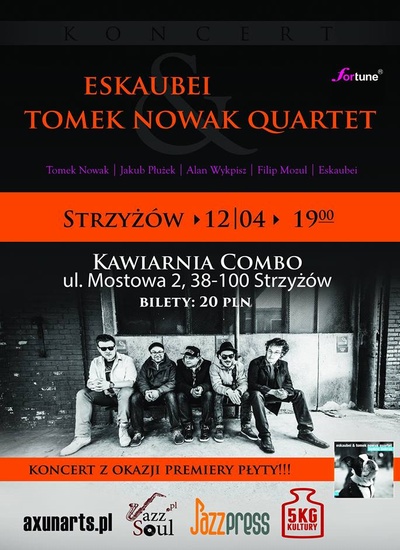 Drugi weekend kwietnia (10-12) zapowiada się pracowicie dla kwartetu Tomka Nowaka i rapera Eskaubei. Zespół, który w tym miesiącu wyda swój debiutancki album, przez trzy dni odwiedzi trzy miasta promując w nich materiał swoją muzykę. W pierwszy dzień mini trasy, 10 kwietnia, w warszawskim klubie Haredna odbędzie się koncertowa premiera płyty. Więcej na ten temat pisałem tutaj.