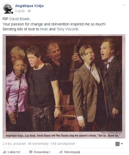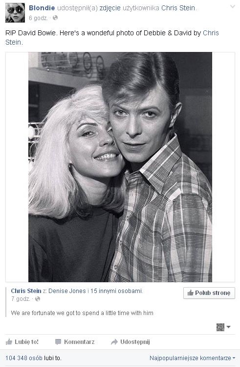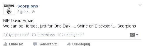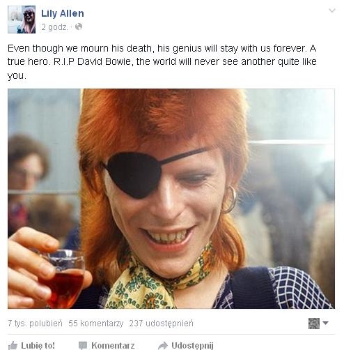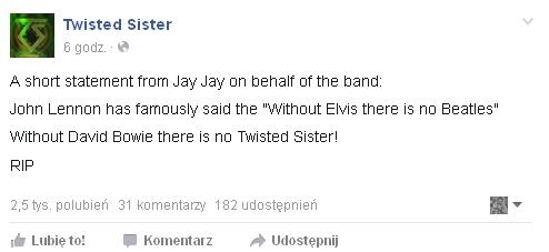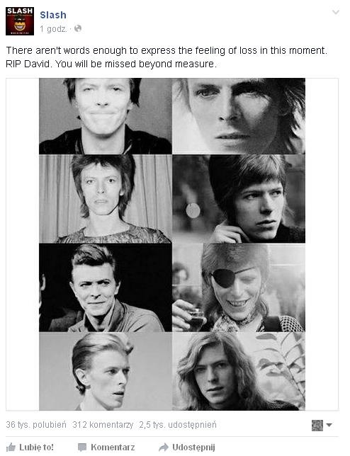Nie informowałem w osobnym wpisie o śmierci Davida Bowiego. To żaden brak szacunku lub niechęć w stosunku do artysty. O odejściu muzyka napisano i powiedziano od rana tak dużo, że nawet osoba z premedytacją unikająca mass mediów z pewnością dowiedziała się o tym wydarzeniu. Umyślnie dzisiejszy odcinek cyklu Gold Song także postanowiłem poświęcić innemu wykonawcy. Dlaczego zapytacie? Chciałem, aby o Bowiem wypowiedzieli się ci, na których miał wpływ, których inspirował do tworzenia nowych, lepszych utworów. Przedstawiciele świata muzyki pożegnali artystę na swój sposób – w social media. Jedni, jak na przykład Blondie, Ringo Starr i Paul McCartney, opublikowali archiwalne zdjęcia. Beyonce napisała lakoniczne „R.I.P”. Kilku wykonawców pokusiło się o rozwinięcie tematu. W komentarzach zawsze podkreślano geniusz artysty (Lily Allen) lub nazywano go wizjonerem (Bruce Springsteen). Byli także tacy, którzy wykorzystali okazję do przypomnienia wspólnych nagrań. Tak zrobili chociażby Pet Shop Boys. Gitarzysta Twisted Sister, Jay Jay French, stwierdził nawet, że jego zespołu nie było bez zmarłego dzisiaj piosenkarza. Poniżej wybrane wpisy z Facebooka. (MAK)
