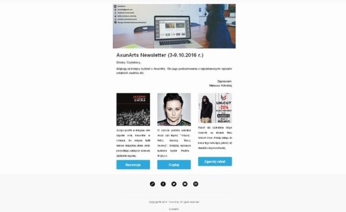 Uprzedzając Wasze ewentualne obawy przed spamowaniem: obiecuję, że newsletter od AxunArts zagości w Waszych skrzynkach pocztowych tylko jeden raz w tygodniu (konkretnie w sobotę) i będzie obejmował informację o najciekawszych wpisach, jakie pojawiły się na blogu w przeciągu minionego tygodnia. Pierwsza „wysyłka” za tydzień, 15 października. Ewentualne pytanie związane z powyższym tematem proszę kierować na mój adres (axunarts@gmail.com) lub zadawać je w komentarzach pod tym wpisem. (MAK)