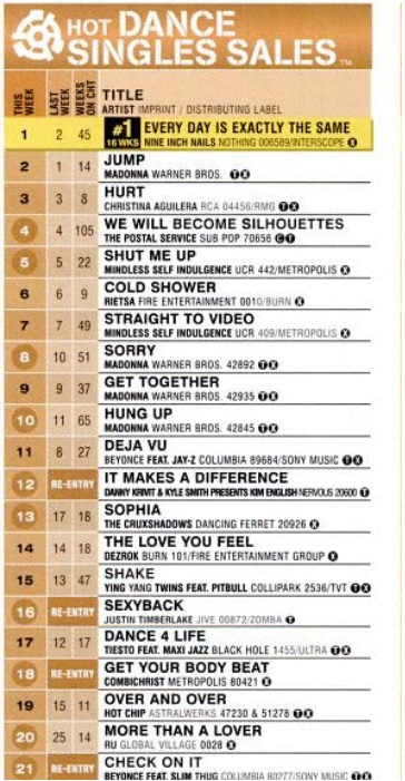 W numerze magazynu „Billboard” z 24 lutego 2007 roku, zapoznając się z kolejnymi listami i zestawieniami płyt oraz singli, dopatrzyć można się ciekawej rzeczy. Pierwsza dziesiątka notowania Hot Dance Single Sales Chart zdominowana została przez Madonnę, która umieściła w niej aż cztery utwory: „Jump” (miejsce 2.), „Sorry” (8.), „Get Together” (9.) i „Hung Up” (10.). Wszystkie piosenki pochodzą z dziesiątej studyjnej płyty wokalistki zatytułowanej „Confessions On A Dance Floor”, która swoją premierę miał w listopadzie 2005 roku. Pomimo takiej liczby utworów w czołówce, to nie Królowej Muzyki Pop przypadła możliwość triumfu (przynajmniej w tamtym tygodniu). Na szczycie znalazła się propozycja zespołu Nine Inch Nails – „Every Day is Exactly The Same”. Smaczku całej sytuacji dodaje fakt, że singiel projektu dowodzonego przez Trenta Reznora i Atticusa Rossa jest kawałkiem o mocno rockowym brzmieniu. Kuriozum.