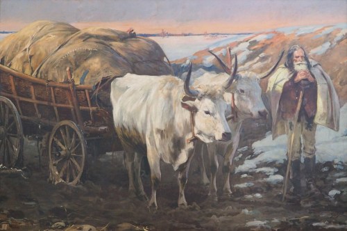 Jan Styka „Woły w zaprzęgu” – fragment Panoramy Siedmiogrodzkiej, olej na płótnie, 185×275 cm, 1897 r. (foto: Jolanta Więcław, materiały prasowe BWA Tarnów)