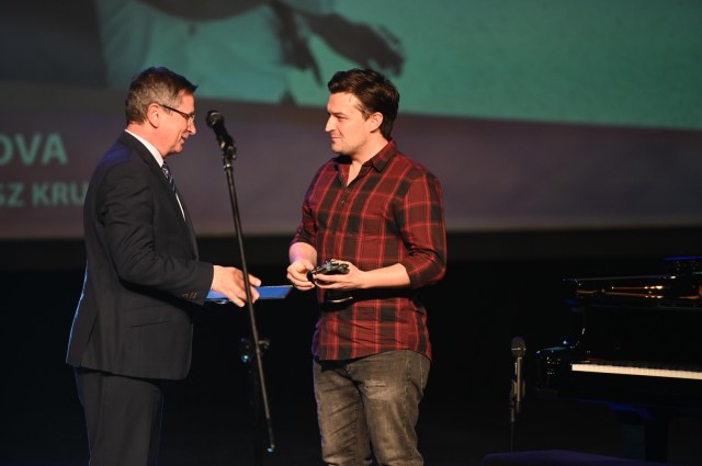 Reżyser Bartosz Kruhlik odbiera z rąk prezydenta miasta Tarnowa Romana Ciepieli Nagrodę Grand Prix za film „Supernova” (foto: Paweł Topolski, materiały prasowe organizatora)