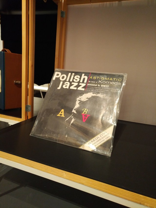 To blog muzyczny, więc naturalną rzeczą jest, że moją uwagę przykuły przede wszystkim eksponaty związane z tą dziedziną. Były to przedmioty nie byle jakie i, patrząc z perspektywy kolejnych dekad, niezwykle ważne dla rzeszy słuchaczy. Bo co, jak nie gramofon Bambino, zrewolucjonizowało możliwość odtwarzania muzyki i obcowania z nagraniami ulubionych wykonawców? Walkman? OK, macie rację, tylko ta wystawa dotyczy innego zakresu tematycznego i to nasz rodzimy adapter jest tutaj niezastąpiony. Drugim ważnym przedmiotem znajdującym się na ekspozycji jest okładka winylowego wydania płyty „Astigmatic” zespołu Komeda Quintet. Kultowy projekt, z którego Rosław Szaybo mógł być naprawdę zadowolonym (w dorobku artysty znajduje się jeszcze wiele efektów współpracy z muzykami, o czym pisałem już jakiś czas temu).